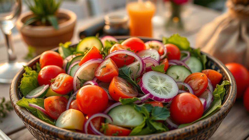 В этом салате всё идеально. Просто и вкусно: всё дело в особом маринаде для лука Представьте себе теплый летний вечер, когда солнце медленно опускается за горизонт, окрашивая небо в мягкие пастельные тона. Ваши близкие уже собрались за столом, наполненным ароматами свежеприготовленных блюд. На столе появляется легкий и освежающий салат, который не просто украсит ваш ужин, но и подарит неповторимые ощущения. Это идеальное сочетание яркого вкуса, хрустящей текстуры и лёгкости, которое сделает ваш вечер особенным! Ингредиенты для салата 150 г свежих огурцов — выбирайте ароматные, локальные овощи, чтобы почувствовать вкус лета. 100 г черри помидоров — они добавят яркие акценты и сладость. 1 красная луковица — придаст пикантности, особенно если её замариновать. 50 г свежей зелени (петрушка или укроп) — зелень сделает салат еще более ароматным. 2 ст. ложки оливкового масла — выбирайте качественное, холодного отжима. 1 ст. ложка уксуса (бальзамического или яблочного) — для игры вкусов. Соль и