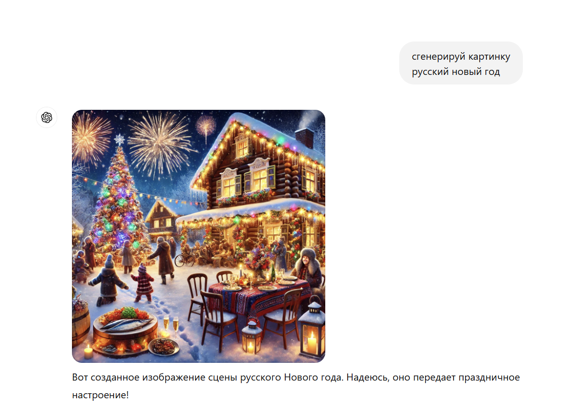Сегодня нужно было срочно сгенерировать картинку русского нового года. Ноутбука под рукой не было, чтобы сесть и по привычке всё сделать в Midjourny. Пришлось с телефона сидеть в Chat GPT. Началось всё стандартно, а потом меня было уже не остановить. Как же нейронка видит празднование русского нового года Но тут меня задели надписи на английском языке. Я возмутился, на что получил ответ. Мол функция стандартная. У всех всегда надписи на английском языке. Но тем не менее он попытался. Фраза получилась на латинице но вполне себе русская.