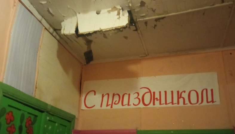 Главный центр культуры поселка в целом выглядит плачевно: протекает крыша, в помещении давно не было косметического ремонта. Нет водопровода, канализации и, соответственно, туалета. За пределами этого заведения его тоже нет. Площадь здания дома культуры по местным меркам довольно большая, но пригодная для работы зона только одна, в которой поселился вечный холод.