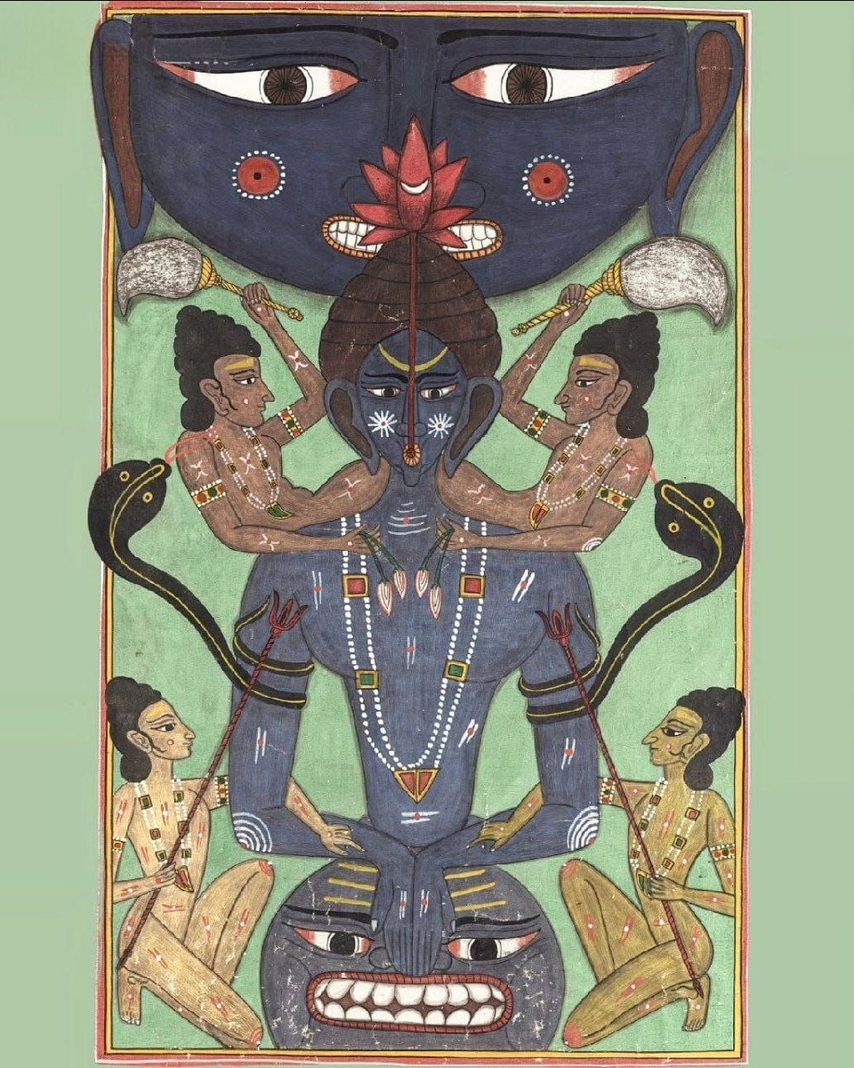 Это редкое тантрическое изображение пробуждения и восхождения Кундалини-Шакти 🐍, изначальной энергии, которая, как полагают, находится у основания позвоночника. Здесь показано путешествие Кундалини, когда она поднимается через чакры, достигая кульминации в слиянии с космическим сознанием 🌌, символизируемым Махакалой — вневременным аспектом Шивы 🕉️. Постепенно нижняя часть тела, представляющая Муладхара-чакру (корневую чакру) 🌱, трансформируется в яростный образ Махакалы, олицетворяющий грубую силу созидания и разрушения 💥, заключенную в корневой энергии. Это изображение подчеркивает центральное убеждение Тантры в том, что человек (микрокосм) 🌍 отражает космос (макрокосм) ✨, и говорит о том, что энергии внутри человеческого тела являются отражением вселенских сил 🌠. Кундалини продвигается через Вишуддху в горле 🔵 и Аджну, обозначенную желтым полумесяцем 🌙. Наконец, она достигает Сахасрара-чакры, которую символизирует сияющий красный лотос 🌺. Этот лотос превращается в круглое л