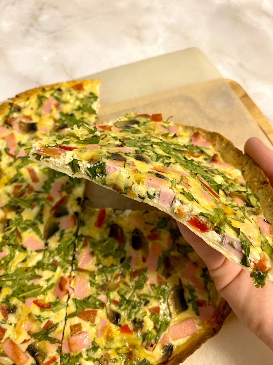 Ингредиенты: Лаваш - 1 круглый Яйца С0 - 3 шт Творог в брикете - 70 гр Колбаса вареная - 3 ломтика Перец красный сладкий - 1/2 шт Помидор - 1/2 шт Шампиньоны - 1 шт Горсть рукколы Горсть тертого сыра Соль, перец Приготовление: Яйца соедините с солью, перцем и творогом. Взболтайте вилкой. Нарежьте кубиком колбасу, перец, помидор. Шампиньоны нарежьте пластинами. Сыр натрите на крупной терке. Рукколу порубите произвольно. Все тщательно перемешайте, разровняйте по лавашу и уберите в разогретую до 200 градусов духовку на 15-20 минут. P.s Лаваш уложите в любую круглую форму, чтобы были бортики и начинка не вытекала.