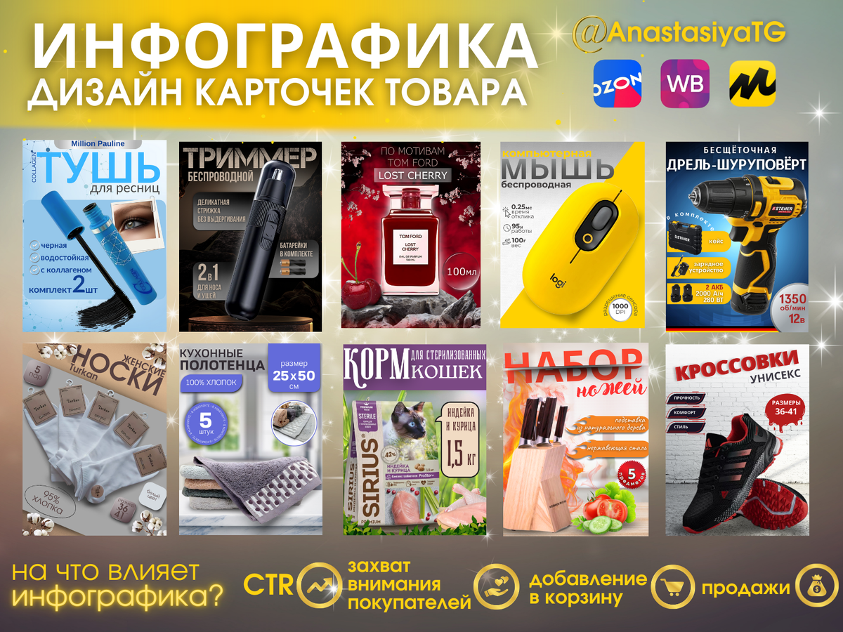 Преобразите свои идеи в яркие визуальные решения! В современном мире, где информация становится все более насыщенной, важно выделяться. Я предлагаю услуги графического дизайна и инфографики, которые помогут вам донести ваше сообщение до аудитории с максимальным эффектом. Мои услуги включают: 🎨 Графический дизайн: Создание уникальных логотипов, визиток, буклетов и рекламных материалов, которые отражают индивидуальность вашего бренда и привлекают внимание клиентов. Продающий дизайн карточек товара, который повысит CTR, захватит внимание покупателей и повысит ваши продажи. 🌐 Дизайн для социальных сетей: Разработка креативных графиков и постов, которые помогут вам выделиться в ленте новостей и привлечь новых подписчиков. 📈 Брендинг: Полный цикл услуг по созданию и развитию вашего бренда — от концепции до реализации. Я помогу вам создать запоминающийся образ, который будет говорить за вас. ✨ Индивидуальный подход: Я внимательно изучаю ваши потребности и создаю уникальные решения