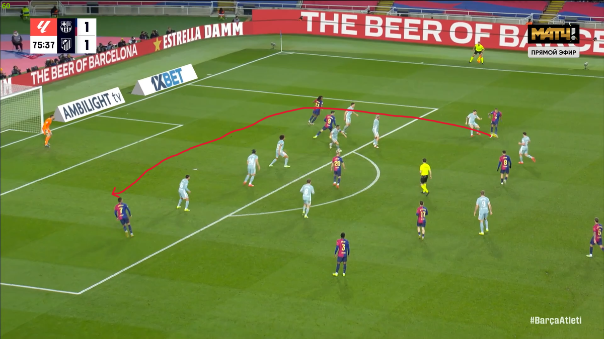 В момент начала голевой атаки на таймере 29:09 и все игроки «Атлетико» находятся за линией мяча, а в 29:14 мяч уже в сетке ворот. Вот так «непреступная» оборона мадридцев развалилась за 5 секунд в полном составе. Понятно, что здесь абсолютно гениально сыграл Педри и увидел этот главный коридор между линиями у соперника, а он же такой наглости и простого прохода никак не ожидал. Плюс пас Гави пяткой, кончено, несколько случаен, но тоже походит на шедевр. В целом, по тактике «каталонцев» мыслей меньше, ведь они провели просто свой стандартный хороший матч, и во многом, без каких-то примечательных тактических моментов, а так игры «сине-гранатовых» мы уже не раз разбирали, можете спокойно почитать) Тем не менее, одно очень важное изменение Флик все же должен был произвести, ведь на месяц вылетел Ямаль после игры с «Леганесом», а значит его надо было заменить, и в целом, кажется, что командными взаимодействиями «Барса» смогла воспроизвести, как минимум, немалую часть функционала Ламина.