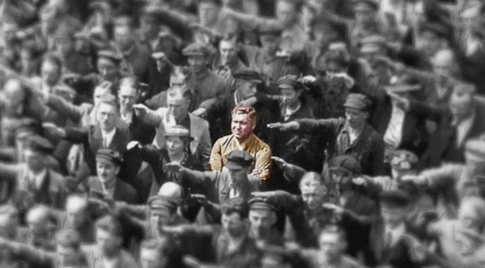 Тысячная толпа вскидывает правую руку в приветствии - на это событие приехал сам Адольф Гитлeр. Только один человек демонстративно сложил руки на груди и презрительно ухмыляется. Да, таким образом Август отстаивал свое право на любовь.