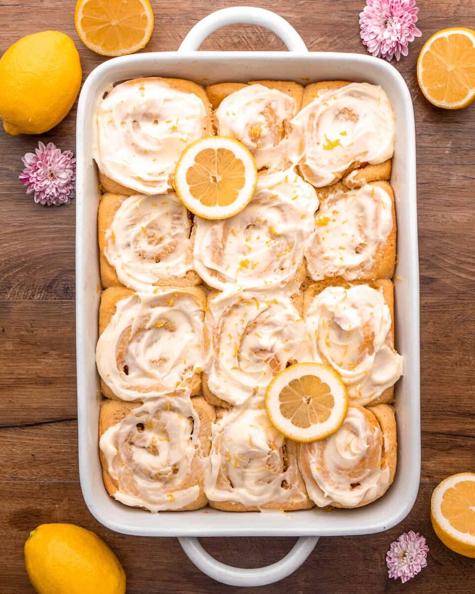 Вы обязательно должны попробовать ароматные, вкусные лимонные рулетики. Ингредиенты для домашних лимонных рулетиков: ШАГ ПЕРВЫЙ: Приготовьте тесто Для начала разведите дрожжи. Смешайте активные сухие дрожжи, немного сахара и теплое молоко и оставьте на 10 минут. Затем в большой миске миксера с насадкой-венчиком смешайте муку, соль и сахар. К сухим ингредиентам добавьте взбитые яйца, ваниль, лимонную цедру и размягченное масло и перемешайте. Добавьте дрожжевую смесь и перемешивайте, пока все не смешается. Переключитесь на крюк для теста и месите на средней скорости в течение 7-10 минут, пока тесто не начнет отставать от краев миски, не сформируется в шар и не будет пружинить при нажатии. ШАГ ВТОРОЙ: Дайте тесту подняться. Скатайте тесто в шар. Положите тесто в большую, смазанную маслом миску. Накройте полиэтиленовой пленкой или кухонным полотенцем и поставьте в теплое место для подъема (для этого хорошо подойдет место на улице или холодная духовка с включенным светом) на 1–1 1/2 часа