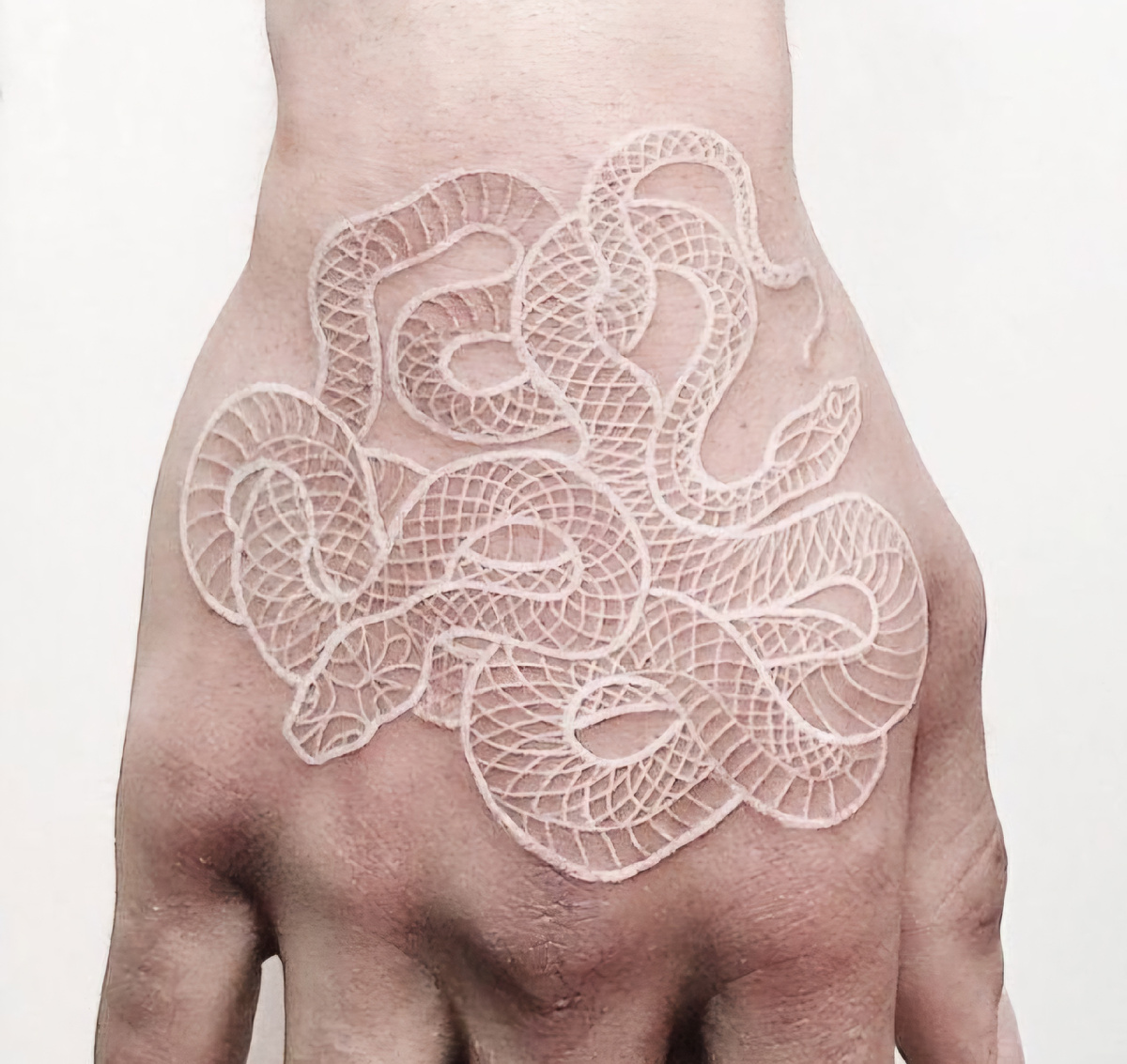 Нюансы белых татуировок, о которых вы не знали Начнем с того, что краска залегает в коже на глубине примерно двух миллиметров. Это дерма, а сверху тонкий и постоянно обновляющийся слой эпидермиса (именно он отшелушевается во время заживления тату, именно про него говорят, когда сходит загар) -это тонкая пленка, которая постепенно нарастает слой за слоем. И дерма и эпидермис - не прозрачные слои кожи, иначе мы бы видели все наше мяско Поэтому тату, залегая в кожу на глубокий уровень, постепенно закрываясь новыми слоями кожи, находится как бы под бежевым фильтром. Если взять пергаментную бумагу и накладывать ее слой за слоем на распечатаную картинку, она будет становиться более мутной и светлой, приобретая бежевый оттенок Также и с тату Но если черный цвет более яркий и с годами уходит в серый, синеватый или зеленоватый (тут зависит от качества краски, вашего подтона кожи, чем он теплее, тем более зеленоватый будет тату, чем холоднее, тем синевато - сероватой), то белый пропадёт п