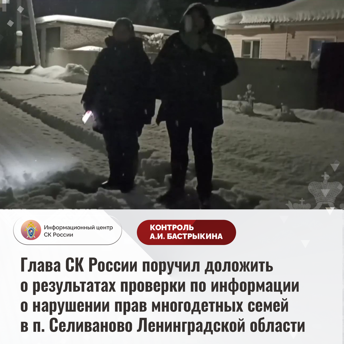 Глава СК России поручил доложить о результатах проверки по информации о нарушении прав многодетных семей в п. Селиваново Ленинградской области В социальной сети сообщается о предоставлении многодетным семьям из поселка Селиваново Ленинградской области неблагоустроенных земельных участков. В 2021 году гражданам для индивидуального жилищного строительства выделены участки без подъездных дорог и уличного освещения, в связи с чем до настоящего времени они не могут начать работы по возведению домовладений. Кроме того, коммунальными службами не осуществляется своевременная очистка территории от снега. Многочисленные обращения в профильные структуры результатов не принесли. В СУ СК России по Ленинградской области организована процессуальная проверка. Председатель Следственного комитета Российской Федерации Александр Иванович Бастрыкин поручил руководителю СУ СК России по Ленинградской области Сергею Тихоновичу Сазину представить доклад о ходе и результатах процессуальной проверки, поставив ее