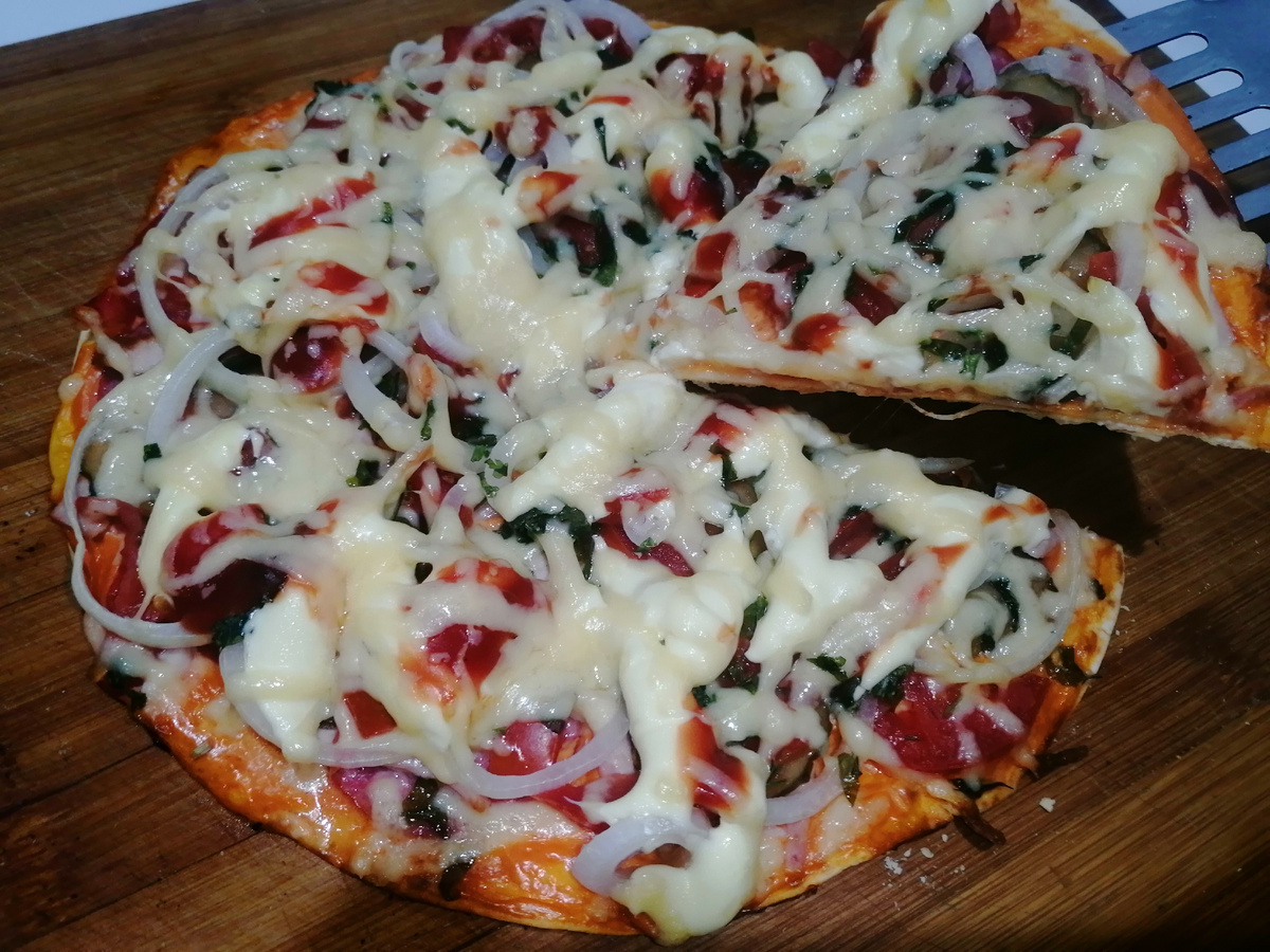Всем привет, вчера вечером смотрел сериал и понимаю, что хочется что нибудь вкусненького. Открываю холодильник и понимаю, что особо не разгуляешься. Нашёл лист лаваша, остатки колбасы и сразу понял что получится бомбическая пицца. Берём лаваш. Выдавливаем прямо на него майонез и кетчуп, размазываем. Раскладываем колбаску. Еще валялся кусочек какой то колбасы. Туда же. Сверху маринованные огурчики. Дальше помидоры, свежих не оказалось, беру маринованные. Закидали прямо вот как есть, нам же не на выставку) Дальше репчатый лук, я нарезал кольцами. Сверху посыпал зеленью из морозилки и взбрызнул ещё майонезом и кетчуп ом немного, будет сочная. Ну и в конце конечно же сыр, тоже был небольшой кусочек. Отправляем нашу красоту в солярий, 7 минут 180 градусов. Ой какая бомба получилась! Идём смотреть сериал.. 👍