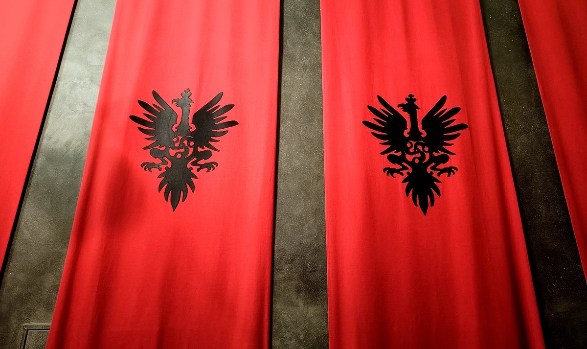 Слева – чёрный орёл с герба Радзивиллов, о чём вы уже знаете. Поначалу гербом Радзивиллов были «Трубы», их вы видите на груди у орла: три трубы, пересекающиеся в центре, были средневековым польским вариантом распространённого в Европе с древнейших времён солярного символа трискелиона. «Трубы» использовали в качестве герба многие польские шляхетские семьи. После того, как Радзивиллам дали титул князей Священной Римской империи в XVI веке, к их символам добавился чёрный орёл на золотом фоне, типичный для немецкой геральдики. Ну а «Трубы» аккуратно разместились на его груди.