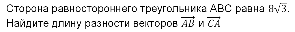Задача Источник: вар 270 Решение Сначала сделаем чертеж Разность векторов сложнее, чем их сумма. Поэтому желательно перейти к сумме векторов. От разности векторов перейдем к их сумме: Если векторы отложены от одной точки, то удобно пользоваться правилом параллелограмма Правило параллелограмма Если векторы отложить от одной точки, то сумма и разность этих векторов – диагонали параллелограмма, построенного на этих векторах: Воспользуемся правилом параллелограмма: Таким образом, разность, заданных по условию векторов, это вектор AD Надо найти длину отрезка AD По свойству диагоналей параллелограмма: AO=OD Учитывая, что АВС – правильный треугольник: АО – медиана и высота Воспользуемся формулой для высоты правильного треугольника: