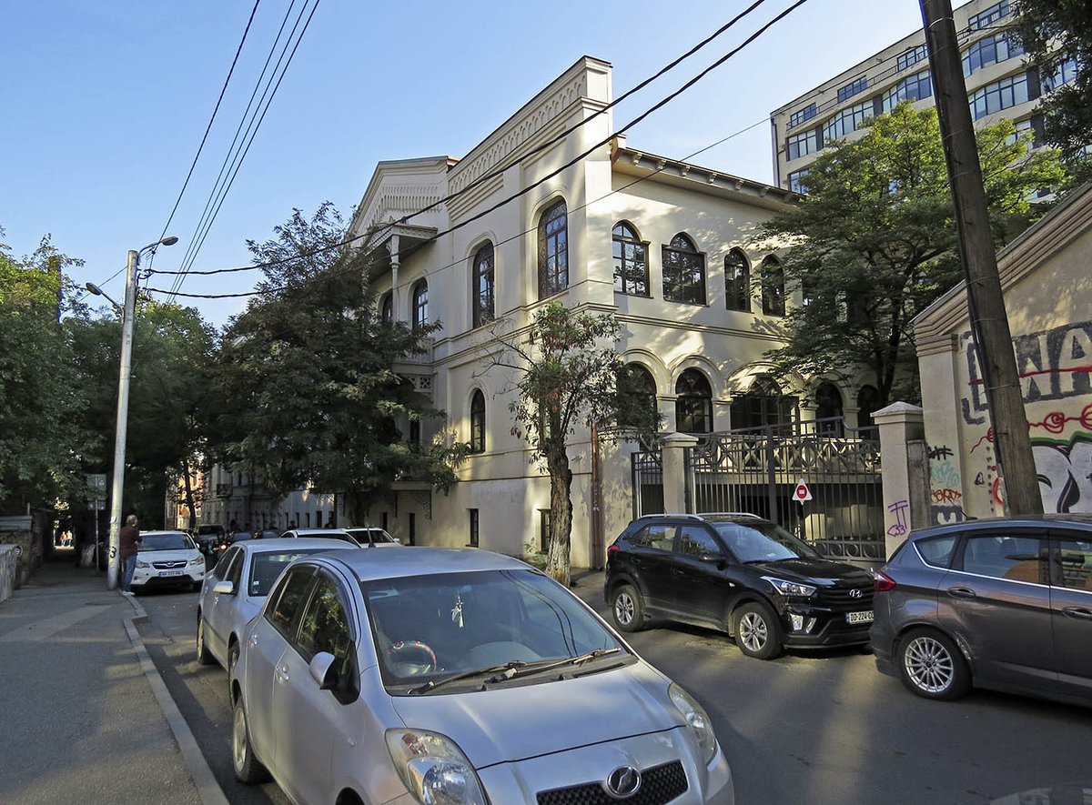 На тбилисской улице Грибоедова обязательно нужно увидеть Академию художеств имени Аполлона Кутателадзе, за деревьями старательно не дающуюся взять её в кадр целиком. Это здание построил в 1856-59 как свой особняк армянский купец, икряной магнат Вардан Аршакуни, которому, видимо, было слишком тесно даже в Сололаки.