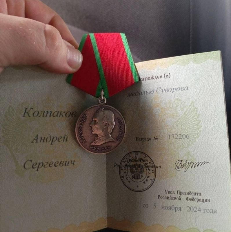 Военнослужащий из Грачёвского района Оренбургской области Андрей Колпаков проявил мужество и героизм в зоне спецоперации. О награждении оренбуржца на своей странице в соцсети сообщил глава Грачёвского района Денис Филатов. — С гордостью сообщаю, что 5 ноября 2024 года указом Президента Российской Федерации, за личное мужество и отвагу, проявленные при защите Отечества и государственных интересов России в боевых действиях, наш земляк Колпаков Андрей Сергеевич был награжден государственной наградой – медалью Суворова! — написал Филатов. Он поздравил бойца с высокой наградой и пожелал успешного выполнения поставленных задач. А также выразил слова благодарности его родителям — Желаю здоровья и успешного выполнения поставленных задач. Особая благодарность Сергею Анатольевичу и Галине Алексеевне за то, что воспитали такого доблестного человека. Ваша сила духа вдохновляет нас всех! — говорится в сообщении Отметим, госнаграду России — медаль Суворова 2 марта 1994 года была учреждена Указом Пре