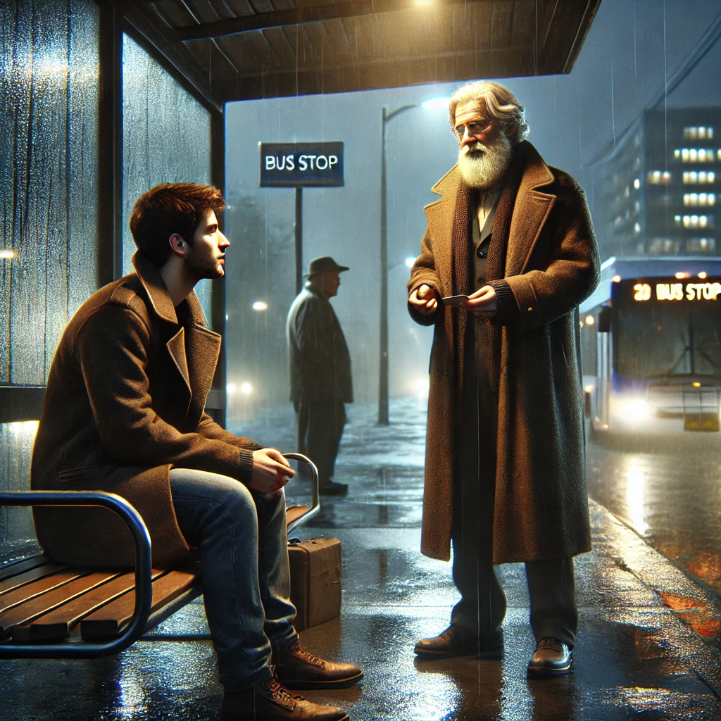 Артём вышел из офиса в девять вечера. Серая улица блестела от дождя, и редкие прохожие, закутанные в куртки, торопились домой. На остановке он заметил пожилого мужчину. Тот сидел на скамейке, будто дождь вовсе не замечал. Капли стекали по его потрёпанному плащу, но он и не думал прятаться — напротив, его осанка и спокойное лицо словно говорили, что в этой жизни его уже ничем не удивить.
