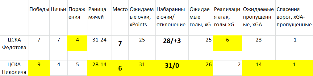 Даже поверхностный анализ показывает, что при Николиче ЦСКА стал лучше примерно во всем: больше побед, больше очков, лучшая разница мячей, более высокое место в таблице. По метрикам xG также видно, что армейцы стали лучше играть в атаке (больше ожидаемых голов), почти на порядок улучшили игру в защите ( в 1,5 раза меньше ожидаемых пропущенных). Единственное, в чем сегодня ЦСКА хуже прошлогоднего – в реализации атак. Кстати именно на «плохую реализацию» предыдущий рулевой ЦСКА сетовал в своих интервью, объясняя неудачи, что сегодня выглядит еще большей неправдой, чем год назад, когда в РПЛ только Локо имел лучшую реализацию голевых шансов.