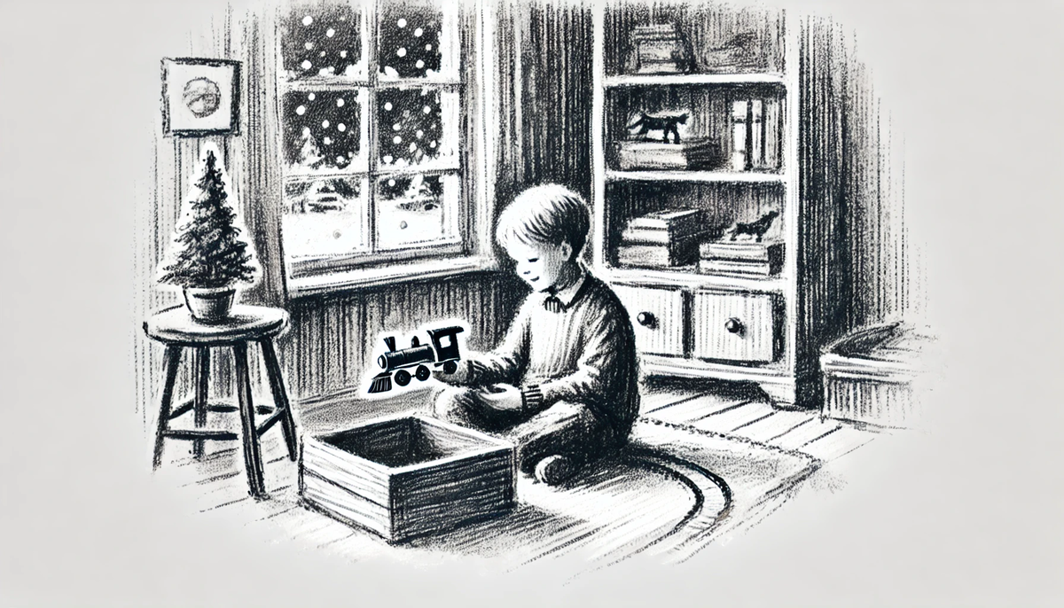 Когда вечер начал подходить к концу, Саша всё ещё играл с поездом. Он придумал для него целую историю: поезд вёз важных пассажиров через снежные поля к далёкому городу. Мальчик с увлечением водил паровоз по деревянным рельсам, которые когда-то сделал его отец.