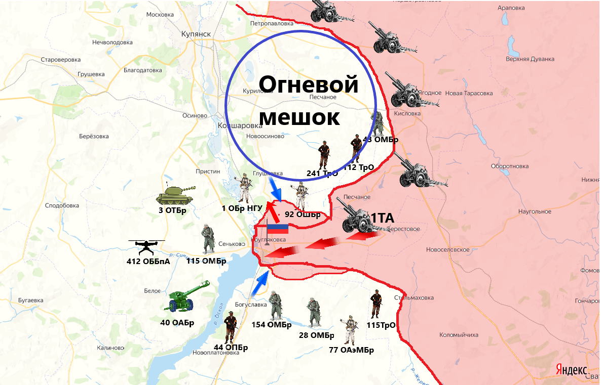 Богуславское направление. 30 км южнее Купянска Из сводки МО от 22.12.24 ВС РФ освободили Лозовую Краткая предыстория. 1-я Танковая армия в ноябре продавила оборону противника до самой Кругляковки и вышла к разрушенному мосту у Сеньково. Тем самым рассекла всю купянскую группировку надвое. Северную часть рассматривать в этой статье не будем, нас интересуют исключительно южная группировка. Итак, мост в Гороховатке уничтожен еще летом, наш Генштаб подготавливал наступление. Логистика теперь у ВСУ идет через Оскольскую дамбу, это 20 км южнее. Одновременно с 1ТА, наша 20-я армия ведет наступление в направлении Боровой и штурмом овладевает населенным пунктом Копанки. Обеспечив себе левый фланг наступления на Боровую по удобному шоссе, как говорят немцы - "Панцерштрассе", которое прикрывают части 3-й танковой бригады ВСУ. Взятие Боровой отрезает всю группировку противника из 5-6 полнокровных бригад. Осознавая угрозу в полной мере, противник подтягивает из резерва 3-ю штурмовую и пытается ве