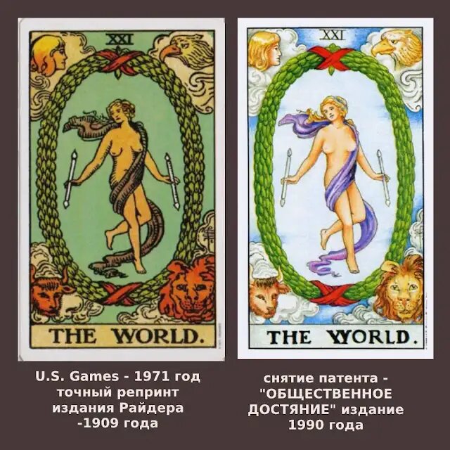 В видео, о колоде "Райдера-Уэйта", я рассказал, что две актрисы и подруги Памелы Колман Смит послужили прообразами и моделями для персонажей карт, там где блондинка, это - Эллен Терри, лучшая подруга которая и дала ей прозвище "Пикси" (другим именем, для друзей было - "цыганка"). Но, вот другая актриса (шатенка), стала прообразом и моделью только для одной карты - "МИР", звали её - Флоренс Фарр, и то, что она шатенка точно отображено на карте "МИР" первых изданий колоды "Райдера-Уэйта". Однако, мне интересна другая метаморфоза, если посмотреть на первые издания колоды начала ХХ века и издания 1970-х годов (по приобретенному патенту) U.S. Games и сравнить с тем, как начали печатать (и печатают до сих пор!) колоды таро "Райдера-Уэйта-Смит" видны заметные отличия в дизайне, и не только в том, что шатенка стала блондинкой, обратите внимание на цвет неба, в первоначальных колодах он ну ни как, не голубой. Можно строить разные предположения, предположим, такое - "Артур Уэйт, задумчиво рассматривает эскизы Памелы, и говорит - " а, что с небом, почему оно какое-то зелёное?", Памела, в ответ - "заходил Райдер, наш издатель, увидел эскиз, и сказал - "г-жа Смит, у нас с синей краской проблемы, кончается, а вот зелёной, две бочки, не могли бы вы изменить дизайн?", это я иронизирую, хватает синего на других картах и в деталях и в изображении. Но, загадка "зелёного неба" беспокоит пытливые умы, а не только мой. Тогда, в тренде и моде была восточная эзотерика, возможно (маловероятно, но возможно) такой цвет неба имеет свои причины, "нефритовое небо", именно так, в китайской мифологии выглядит небо китайских богов, на их китайском олимпе...