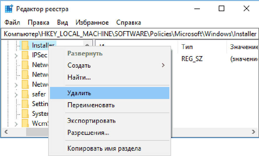 Аналогичным образом, проверьте, есть ли подраздел Installer в разделе HKEY_CURRENT_USER\SOFTWARE\Policies\Microsoft\Windows\ при его наличии, очистите его от значений или удалите.
