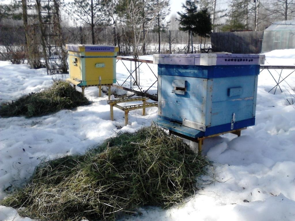 Ульи устанавливают на подставки, которые заполняют шлаковатой, сухим шлаком или речным песком, опилками с примесью битого стекла либо соломой (сеном) с добавлением дератизантов. Нижние летки ульев закрывают, оставляя открытыми верхние летки, которые должны быть закрыты решетками или заткнуты еловыми ветками. После этого поверхность ульев укрывают утепляющим материалом: сухими листьями, стружкой, соломой (сеном) и т. д., обработанными дератизантами, после чего их обертывают рубероидом, плотной бумагой или толем и обвязывают веревкой (проволокой).