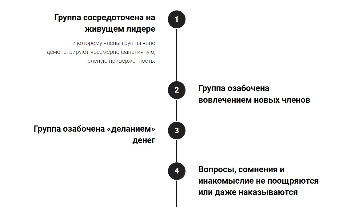 Исследователи утверждают, что многие тоталитарные культы ничего не имеют общего с религией. Религия выступает в культах просто в виде маски существования, накопления ресурсов, доминирования над людьми. Мы редко задумываемся, что все люди разные, и их фантазии, удовольствия и воззрения настолько могут быть экзотичными, что не уложатся в нашей голове. В головах политиков может быть такое, чего мы даже и вообразить не можем. Хотя многое подсказывает, что реальные воззрения, скажем, Иосифа Сталина ничего общего с коммунизмом не имели. Коммунизм был просто маской его существования, как у лидеров культов. Не читал еще Майкла Лангоуни, но взглянул на схему, на которой выделены признаки, по которым он определяет тоталитарный культ (не обязательно все они должны быть в наличии) Очень напоминает тоталитарный коммунистический режим, где "новые члены" - это новые страны блока, а "делание денег" - увеличение материальной мощи государства, повышающей статус вождя (что совершалось в коммунистических