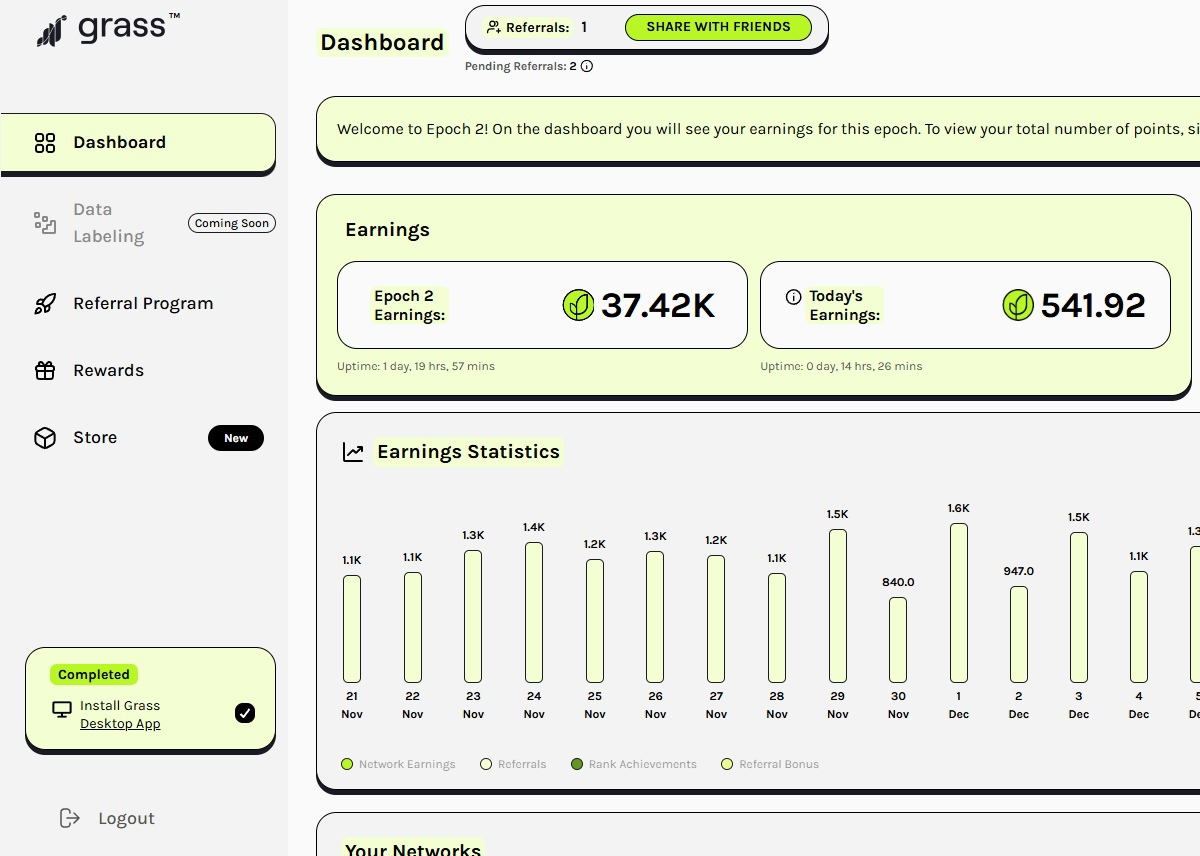Grass – это революционная сеть, позволяющая миллионам пользователей монетизировать свою неиспользуемую пропускную способность интернета. Вместо того чтобы просто “платить за интернет”, Grass дает возможность использовать его потенциал и получать вознаграждение. Как это работает? Всего в три клика вы подключаете свое неиспользуемое интернет-соединение к сети Grass. Ваши ресурсы используются проверенными учреждениями для поддержки их онлайн-сервисов. Ваш вклад отслеживается в виде баллов Grass, которые в дальнейшем влияют на количество токенов Grass, которые вы можете получить. Почему это выгодно? Как начать? Процесс подключения к сети Grass максимально прост. Ваша активность отслеживается в личном кабинете, где отображается накопление баллов Grass. Эти баллы, вместе с факторами использования вашей полосы пропускания и местоположением, определяют ваше вознаграждение в токенах Grass. Первый сезон сети Grass завершился, и теперь токены, которые уже были зачислены участникам, доступны для и