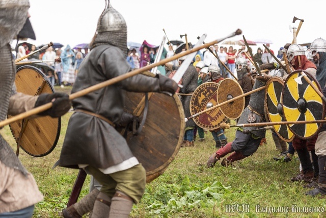 #реконструкция #ранятина #эпохавикингов Но, конечно, в ранятине и не без минусов тоже. Как уж водится, это продолжение плюсов. Во-первых, ранятина - это больно! Из доспехов у вас только шлем, да и тот с открытой рожей, шеей и затылком. Никаких тебе латных рук и ног. За защиту кисти и голени отвечают бабушкина прихватка с кухни и намотанные обмотки. Через это, в каждом сражении вам приходится надеяться на сознательность вон того парня с выпученными от страха глазами. Что он правила читал и хотя бы фрагментарно запомнил:) Во-вторых, в ранятине слишком много места для творчества! Далеко не каждый реконструктор способен понять, что его творение уродливо, ужасно, сшито не из того и носится не так.Процент костюмов выглядящих так, как будто их сняли с мёртвого бомжа и не погладили, в ранятине необычайно высок:) В-третьих, сражения в ранятине похожи на что угодно, кроме сражений! Куда-то бегущие полуодетые люди и закручивающийся на поле боя крендель из строёв противоборствующих