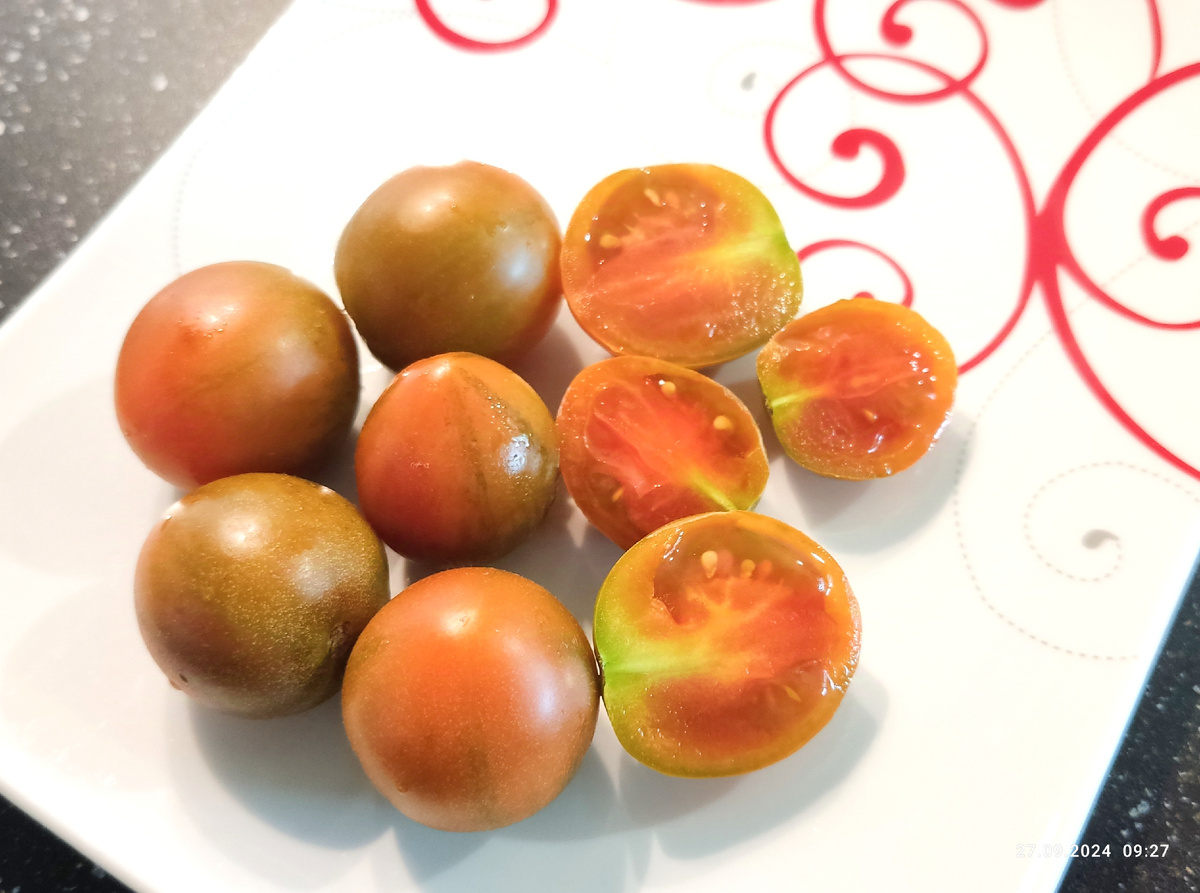 Индетерминантный, но при этом довольно раскидистый куст. Не скажу, что мощный, но места занимает больше стандартных индетов. Очень урожайный, с хорошей завязываемостью плодов средним весом 30г. И в жару, и в пасмурные прохладные дни не сбрасывал завязи. Очень красивый. На этом пожалуй, плюсы и заканчиваются... Об этом томате начиталась и насмотрелась такое колличество восторженных отзывов, что спала и видела, когда же наконец-то попробую этот чудо помидорчик! Это же надо - томат со вкусом оливок! Вот это да!!! Но ждать пришлось долго. Очень долго... Цвести и формировать плоды он стал одним из первых, но сами томаты я попробовала только к концу лета. По длительности созревания он переплюнул даже долгодумов антоцианов. Это просто жесть... Только представьте эту картину - у него уже плоды, остальные только цветут. Все томаты отцвели, налились, созрели и ушли в дело, а он всё так же висит 🤦🏼♀️ При чём я его пробовала срывать в разных стадиях. Пыталась определить спелость и на ощупь, и н