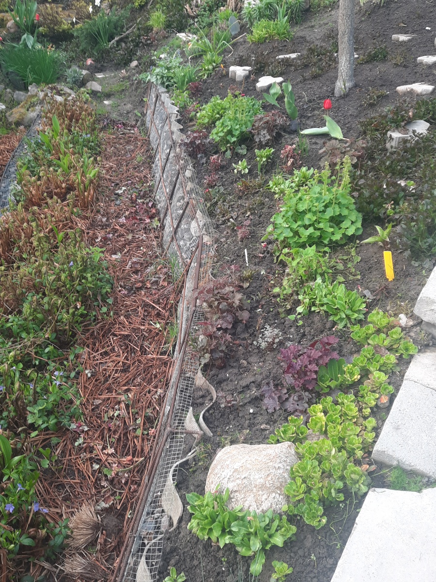 Видите зеленый кустик на полоске цветного бордюра? Вооот! Так это не она! Это камнеломка груглолистная, а она, нет, он, кустик, рядом! О нем сначала пойдет речь. Я его дважды показывала в последние дни. Давно пыталась его вычислить, но неудачно. Видимо, программа у меня неправильная! А вчера мне прислали название и фоточку. Я же не могу мимо такой информации пройти.