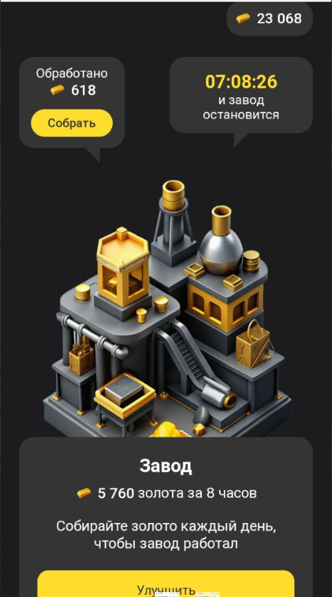 Т-Банк запустил новую игру, которая называется Завод, а найти её можно в приложении Т-инвестиций. Она сразу выскакивает, когда туда заходишь, либо на главной странице в верхних иконках, промотав вправо. Чтобы принять участие, нужно указать свой номер телефона, на него приходит код, ввести его в соответствующее поле, код нужно будет вводить каждый раз при заходе в игру. Не знаю зачем они так сделали, в других играх этого не требовалось. Как играть? Для начала у вас должен быть открыт брокерский счет и установлено приложение Т-инвестиции. Далее все просто: заходите раз в 8 часов и собирайте золото, можно и чаще. Если не заходить, завод останавливается и выработка золота прекращается, пока не зайдете снова. Чем больше денег/ценных бумаг на вашем счете, тем больше золота можно добыть и выше шанс на выигрыш. Если у вас в инвестициях 250000 рублей или больше, то завод можно улучшить до фабрики и получать максимальные 7200 золота каждые 8 часов. В таблице указан уровень шахты, необходимая с