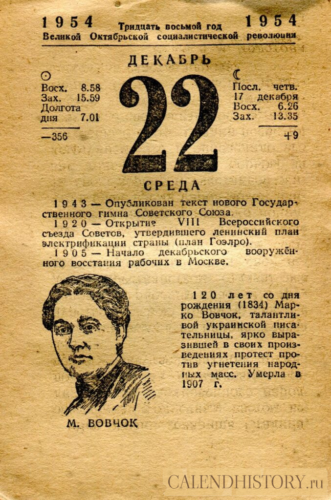 Итак, сегодня 22-го декабря и у нас на календаре 1954-й год. Перед нами листок советского календаря Политиздата. На календаре у нас среда - 22 декабря 1954-го года. М. ВОВЧОК 1943 — Опубликован текст нового Государственного гимна Советского Союза. 1920 — Открытие VIII Всероссийского съезда Советов, утвердившего ленинский план электрификации страны (план Гоэлро). 1905 — Начало декабрьского вооружённого восстания рабочих в Москве. 120 лет со дня рождения (1834) Марко Вовчок, талантливой украинской писательницы, ярко выразившей в своих произведениях протест против угнетения народных масс. Умерла в 1907 г. *** Оборотную сторону листка этого календаря можно посмотреть у нас по ссылке на сайте. Другие листки советских календарей смотрите у нас на сайте - CALENDHISTORY.ru ПОСМОТРИТЕ ЕЩЁ ЛИСТКИ ОТРЫВНЫХ КАЛЕНДАРЕЙ: