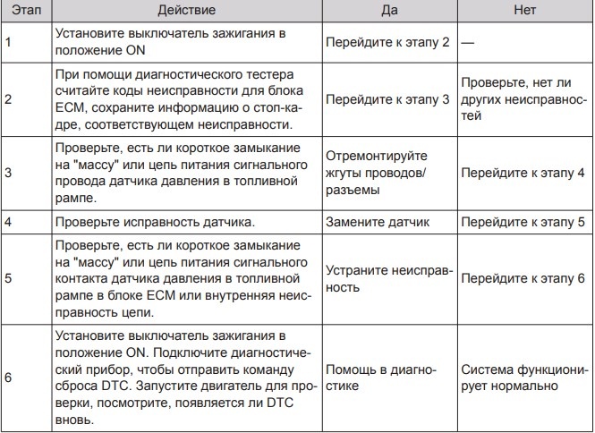 Описание диагностического кода (DTC): некорректный сигнал напряжения датчика давления в топливной рампе. Условия появления DTC: напряжение в цепи датчика давления в топливной рампе ниже 0,2 В или выше 4,8 В.