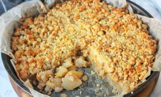 - Запекание: Поставьте форму в разогретую духовку и запекайте около 30-40 минут, или пока крошка не станет золотистой и яблоки не станут мягкими.