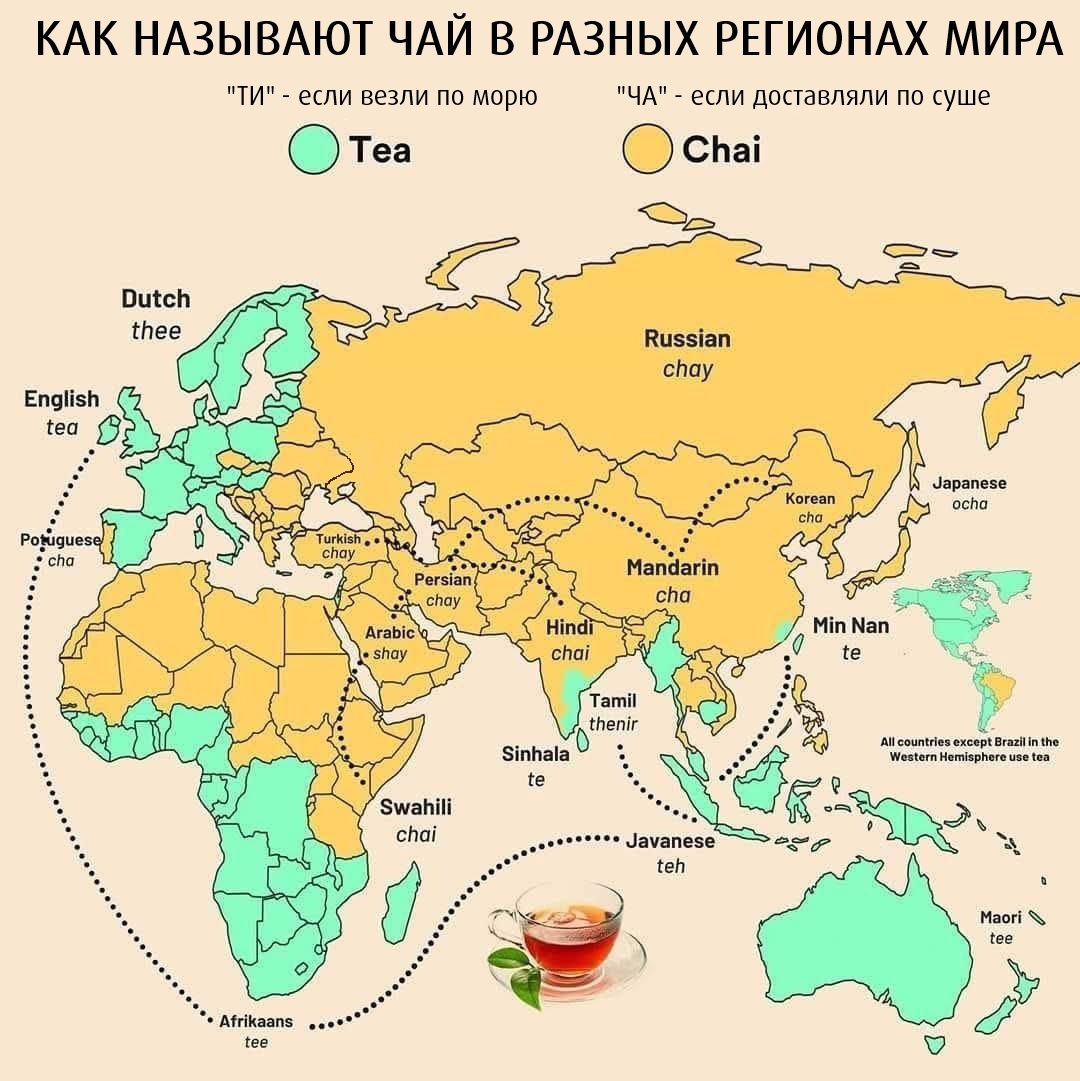 ❓Задумывались ли вы когда-нибудь о том, почему половина мира называет чай «Ти», а другая половина – «чай»? 🫖 Оказывается, все дело в том, как чай добирался на рынки этих государств в былые времена! 🐫 Если чай в страну поступал по суше через Великий Шелковый Путь, то его везли на караванах китайские или индийские купцы, которые называли этот продукт на свой манер «ча» или «чай». ⛵️ Если же чай в страну везли по морю, то его называли «ти», «тэ» или схожим образом. Все дело в том, что в те времена морскую торговлю полностью контролировали западноевропейские страны, которые везли чай из иных, самых юго-восточный районов Китая, Тайваня и Южной Азии, где этот продукт именовался иначе. 🇵🇹 Отдельно на карте выделяется Португалия, которая хоть и находится в Западной Европе, но называет чай «ча». Часть историков связывает это с тем, что будучи доминирующей морской державой прошлого португальцы чаще закупали чай у тех стран, где этот напиток именовали «ча». 👍Ставь лайк, если любишь чай и хоч