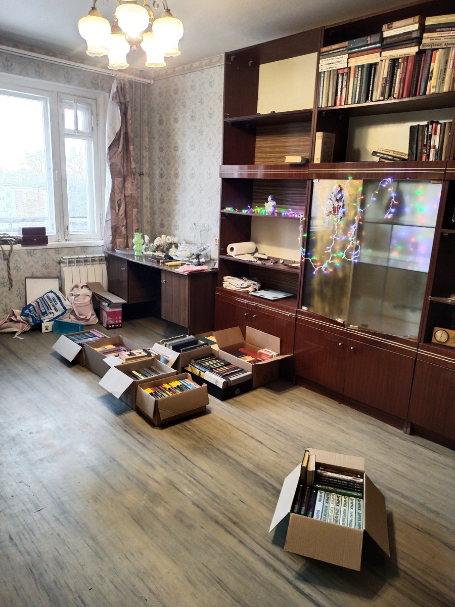 Зато вчера и сегодня эх и пришлось потрудиться... Вчера были в родительской квартире. Большая комната освобождается: кровать забрали, стулья забрали, Андрей постепенно разбирает мебель, книги пакует моя родная подруга Ольга, не знаю, что бы я без тебя делала! Андрей находит всё новые и новые интересности. Вот Снеговик - это память о хоккейных боях на приз газеты "Известия". Не знаю, почему, мама купила аж два подобных хоккейных сувенира. А у меня как раз есть хорошо знакомый тренер хоккейных вратарей! Вот ему будет сюрприз! :) По-моему, только я ничего не делаю. Тру, мою, договариваюсь, отдаю, распределяю - а следов деятельности не видно! Хотя нет. Вот я себе организовала Новый год. :) Дверцы сняты, повесить некуда, зато ваза простаивает. :) Вечером комната уже выглядела иначе. Самый приятный сюрприз - наличие таких же обоев за стенкой. :) Я ожидала увидеть там старые зелёные, а тут - красота! Кстати, у кого из самарских читателей есть необходимость в крепких полках под рассаду, напри