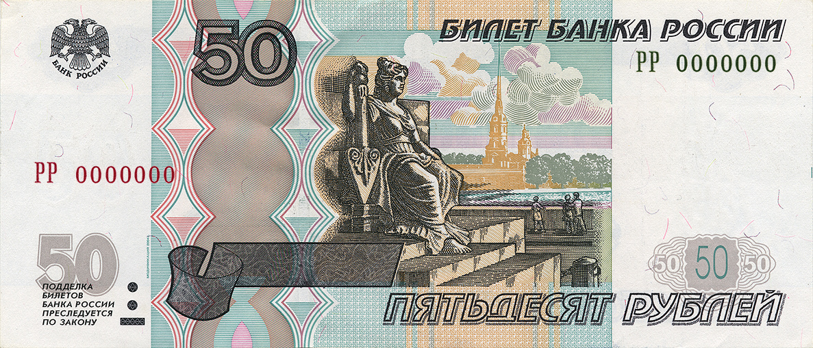 Санкт-Петербург, один из самых известных городов России, изображён на 50-рублёвой купюре. На лицевой стороне банкноты На лицевой стороне купюры — скульптура девы с ростральных колонн, которые стоят на Стрелке Васильевского острова.