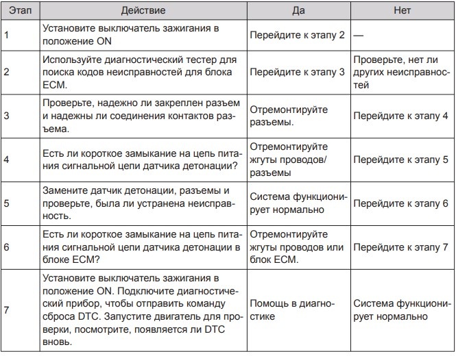 Описание кода неисправности: короткое замыкание на цепь питания сигнальной цепи датчика детонации (контакт А). Описание кода неисправности: короткое замыкание на цепь питания сигнальной цепи датчика детонации (контакт В).