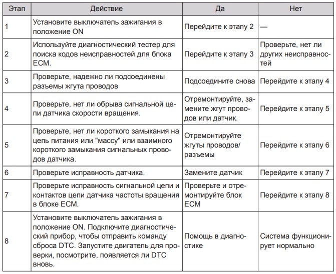 Описание кода неисправности: некорректный сигнал датчика скорости вращения. Описание кода неисправности: потеря сигнала датчика скорости вращения. Условия появления кода неисправности: значение счетчика неисправностей датчика скорости вращения превысило пороговое значение.