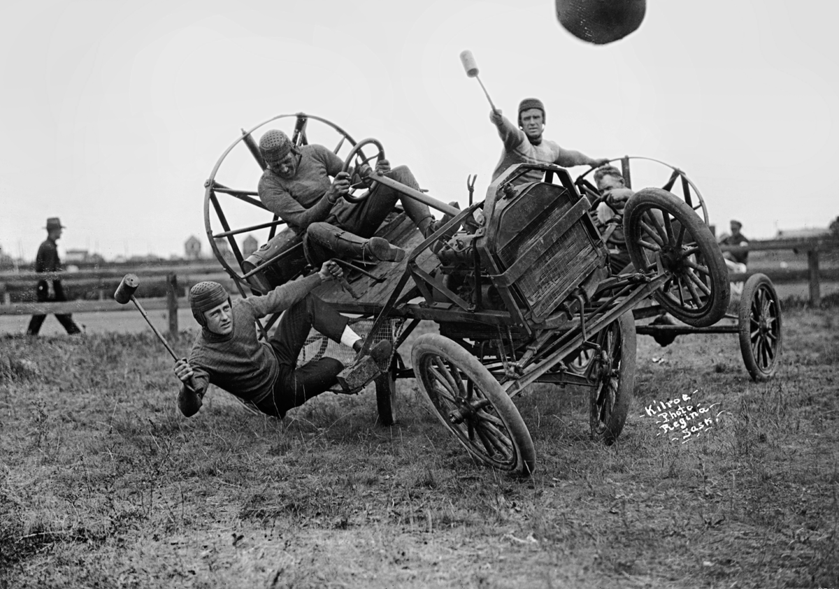 История конного поло уходит корнями во времена Древней Персии, где его использовали для тренировки конных воинов, после чего эта игра распространилась от Египта до Китая, от Константинополя до Индии. И вот в 1902 году благородные и проворные пони заменены на трескучие автомобили и первый матч состоялся в городе Бостон. А идейным вдохновителем стал Джошуа крейн-младший, который одновременно увлекался поло и автомобилями и решил свои два хобби объединить. В показательном атче он выехал на поле элитного поло-клуба Дэдхем на автомобиле и стал ударять по мчу клюшкой, второй рукой удерживая руль. В 1908 году выходит "Форд Т", который благодаря своей доступности, легкости и устойчивости сразу полюбился энтузиастам автомобильного поло. Играли на поле размером 91 на 36 метров с двумя зачетными зонами, ограниченными стойками на расстоянии 15 фунтов. Цель - загнать мяч размером с баскетбольный в эту зону. Бедный судья должен был бегать по полю на своих двоих, уворачиваясь от приближающихся машин.
