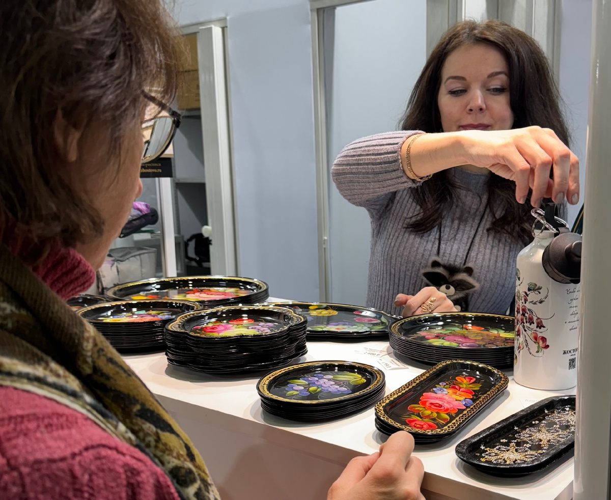Приветствую. В Столице прошла выставка народных промыслов России. Организаторы её назвали «Ладья». Можно сказать, что я успела зайти в последний вагон уходящего поезда. Дело в том, что «Ладья» проходила с 18 по 22 декабря, и я посетила её в последний день, то есть 22 декабря. Какой-либо рекламы о «Ладье» не упоминалась, я случайно узнала о выставке и не раздумывая поехала. Свое мнение вы сформируйте сами, а за себя скажу так — мне понравилось все, кроме высоких цен. Оказалось, что Жостово теперь выпускает чайные и кофейные пары, зонты, блокноты, обложки на паспорт, а также подстаканники. Молодые авторы пытаются делать товары под старину Порадовало, что очень многие авторы представляют свои работы в самобытном русском стиле, а не я-ля Европа. Присутствал и современный креатив Одна мастерица изготовила украшения из тополиного пуха Также было много современной посуды Также был представлен янтарь