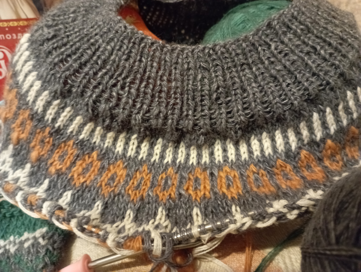 В юности я много вязала жаккардом . Даже в электричке умудрялась вывязывать орнаменты не из двух, а из четырёх, а то и из пяти цветов. В воскресенье едешь учиться на двух электричках , в пятницу едешь домой, и так, глядишь , интересная жилеточка или кофточка свяжется . Вчера приступила к вязанию джемпера с круглой кокеткой с орнаментом. Как же долго его вязать, этот орнамент! Из запланированного на вечер воскресенья не довязала полтора ряда . Устала даже. А рисунок- то несложный. Теперь вернусь к этому занятию только 29 января . Когда будет полноценный выходной. Не люблю жаккард урывками вязать. Нравится сравнительно большой отрезок орнамента закончить, чтобы ясность была)
