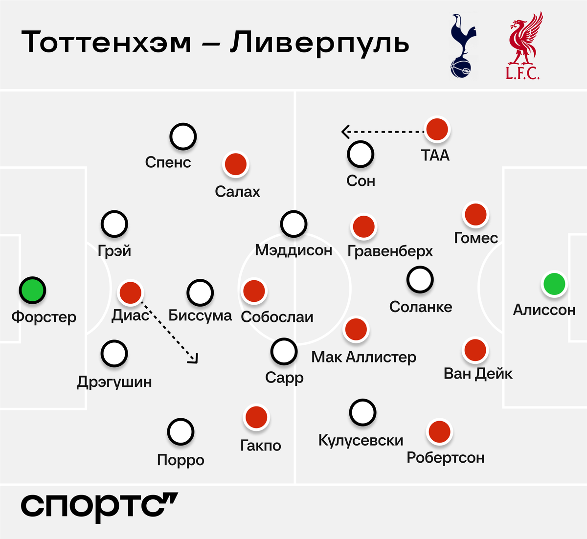 Еще один комплимент Арне прилетает за вторую часть заготовки. Смещения Диаса на левый фланг не создавали пустоту в штрафной «Тоттенхэма». Позицию центрфорварда постоянно кто-то заполнял. По матчу испробовали три варианта – Салах + Собослаи + Мак Аллистер. Иногда открывались все вместе.