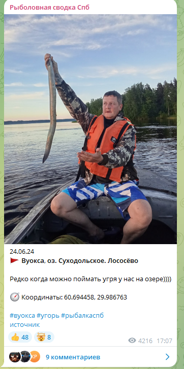 Для всех, кого заинтересовала ловля угря в Ленинградской области и СПб, а также где он водится, подготовил статью про топ лучших мест, на которых попадается угорь. Читайте материал до конца, чтобы узнать, где ловить угря лучше всего и как вообще туда добраться. Эта информация поможет найти свой трофей. 1) Река Вуокса, в частности озеро Суходольское. В нашем регионе водится речной угорь - это проходной вид рыб. Он и нагуливается в пресной воде большую часть жизни, но на нерест уходит в море, совершая очень длинную миграцию. Одним из мест нагула угря является Суходольское озеро, туда он проходит через реку Бурная. Угорь хищник и чаще всего попадается там в ямах на донки с мальком, предназначенные для ловли судака. 2) Финский залив, а именно его часть - Выборгский залив. В районе посёлка Советский среди островов поимки угрей происходят регулярно. Там он тоже попадается в основном на донки для судака по открытой воде, и для налима зимой. Причем некоторые даже ставили донки с берега, но в о