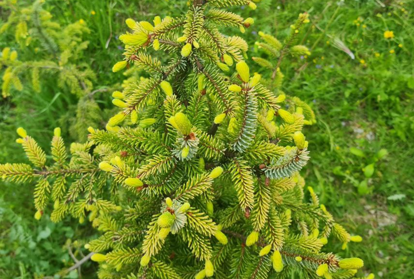 Саженцы Ауреи Ванк уже в детстве имеют сырный цвет и контрастируют с зеленым окружением: