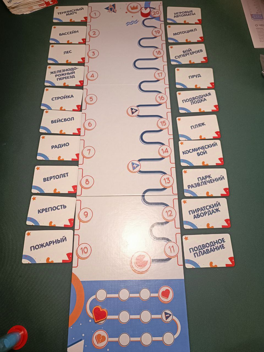 Начали мы с игры "Озвучка". Эта игра нам всем очень нравиться. "Озвучка" - кооперативный патигейм, где слова нужно объяснять звуками. Ссылка на распаковку этой игры будет в конце статьи. Мы сыграли две партии. В первой мы победили достаточно быстро, мы все практически не ошибались. По шкале расстройства мы продвинулись только на 4 клетки. Лена попросила сыграть еще партию, которая прошла менее удачно. Нам показалось, что слова были сложнее, в итоге мы по шкале прогресса продвинулись только на 5 делений и проиграли. Но все остались довольны игрой, было весело.