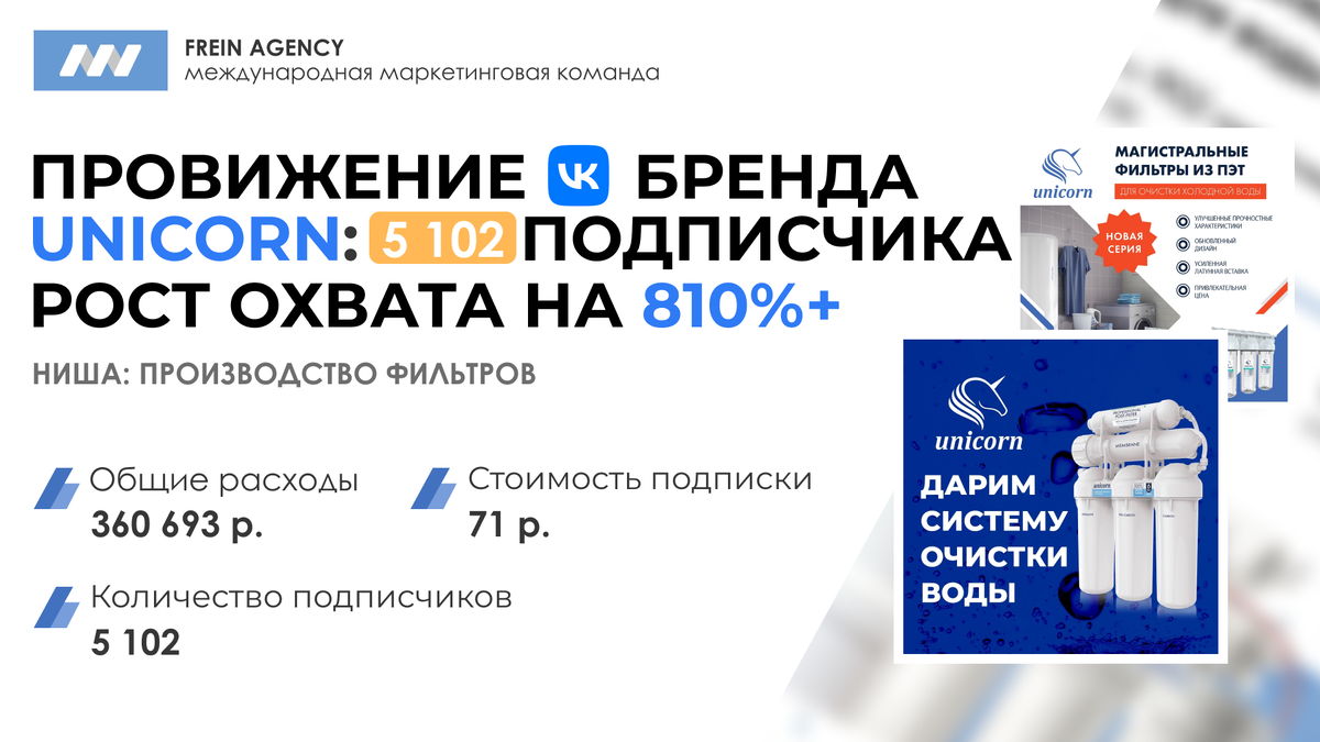 UNICORN — это компания, производящая фильтры для воды, системы очистки, сифоны и гофротрубы. С момента основания в 2014 году она вышла на рынки России, Казахстана, Узбекистана и других стран СНГ, а также получила признание в виде наград, таких как лучший производитель Белгородского района и вошла в национальный реестр ведущих промышленных предприятий России. Когда компания пришла за продвижение бренда компании через таргетированную рекламу в вк, её цель заключалась не просто в увеличении числа клиентов, а в увеличении узнаваемости бренда , создании истории вокруг своего продукта, а также в развитии лояльности и долгосрочных взаимоотношений с покупателями.