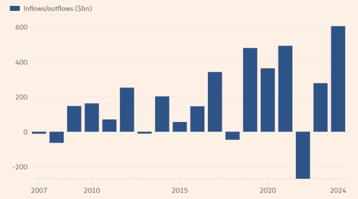По его словам, замедление роста на фоне снижения инфляции побудило инвесторов вкладывать средства в облигации с «повышенной» доходностью. Приток капитала в эти инструменты достиг рекордных значений, несмотря на весьма неоднозначный год: рост ценных бумаг летом сменился падением к концу года. Инвесторы испугались, что ставки будут снижаться медленнее, чем ожидалось, и начали массово продавать активы.