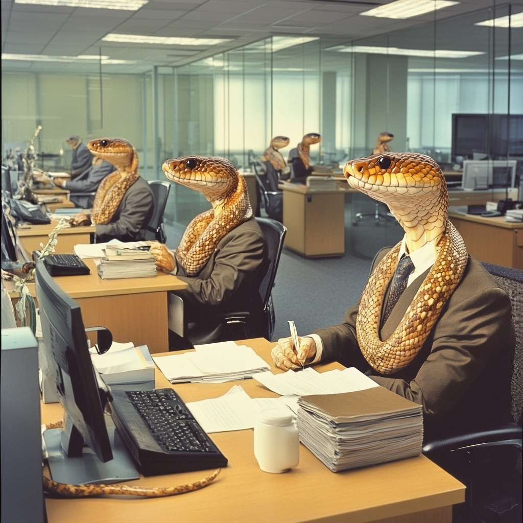 Рабочий коллектив — штука загадочная. Это как террариум, только в нём не ползают, а сидят за компьютерами. Но повадки остаются те же: кто-то подползает с ласковой улыбкой, кто-то шипит издалека, а кто-то тихо душит вас своими задачами. И вот вы думаете: это всё люди или это всё-таки змеи, только в костюмах?