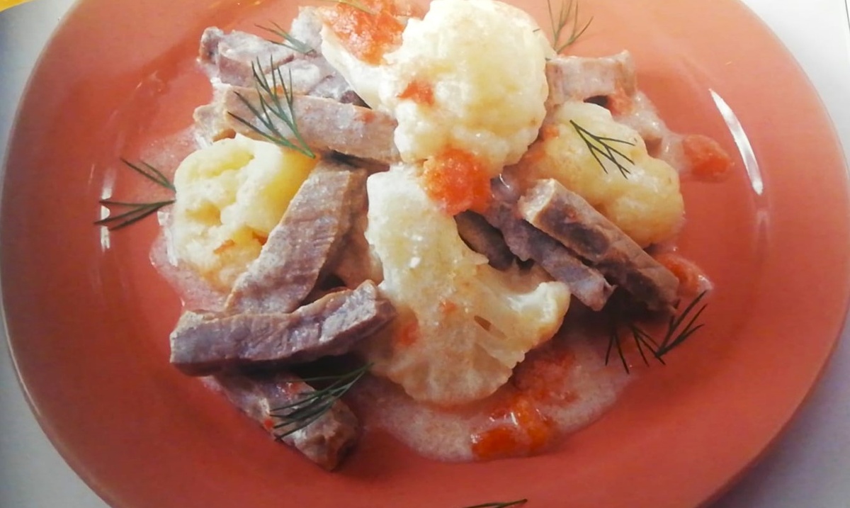 Ингредиенты (на 4 порции): - 150 г мякоти говядины - 1 ст. л. сливочного масла - 2 ст. л. сметаны - 100 г цветной капусты - 1 ч. л. муки - 1 помидор - 1 пучок укропа - соль по вкусу Приготовление: Разделите цветную капусту на отдельные соцветия. Обжарьте их до полуготовности, затем добавьте немного масла. Очистите помидор от кожуры, порежьте его кубиками и положите к капусте. Посолите по вкусу. Сварите мясо до полуготовности, нарежьте его маленькими кусочками, залейте бульоном от капусты и слегка потушите. Затем добавьте сметану и подогрейте её вместе с мясом. Обжарьте муку до золотистого цвета, смешайте её с холодной водой, а потом добавьте к мясу и овощам. Хорошо перемешайте всё это и доведите соус до кипения. Украсьте бефстроганов мелко нарезанной зеленью.