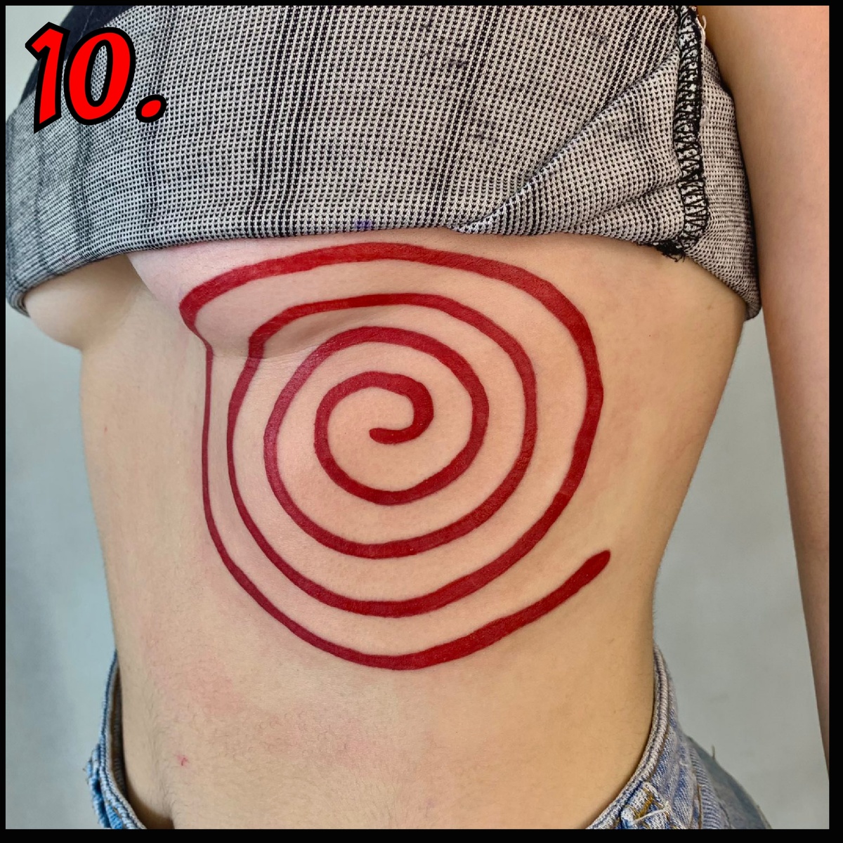 Я бы назвала эту татуировку странненькой, а, может, и больше – ниочемной. Какие возникают ассоциации при виде большой красной спирали на теле? У меня никаких. Хотя, наверное, барышня в эти чернила вложила какой-то свой смысл. Но больше похоже, что она просто попыталась вот так незатейливо привлечь к себе внимание. И у нее получилось.