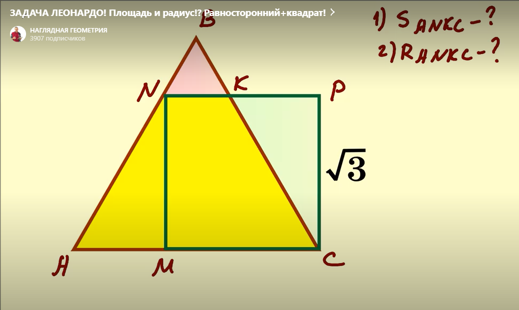 Всем привет, меня зовут Андрей, это снова я! Недавно я увидел на канале Валерия Казакова очень интересную задачу. Но автор этого канала решил эту задачу не самым лучшим и не самым быстрым способом. Я же в данной статье предлагаю более короткий и более простойспособ решения этой задачи. Итак, сама задача: Итак, имеется равносторонний треугольник ABC и квадрат MNPC со стороной, длина которой равна √(3). Нужно найти площадь трапеции ANKC, а также радиус окружности, описанной около этой трапеции. Решение. 1) Нарисуем так чертеж, чтобы были видны градусные меры основных углов: Итак, основные градусные меры - это 30 и 60 градусов. 2) Теперь очевидно, что треугольники AMN и KCP равны (это прямоугольные треугольники, и они равны по катету, который равен стороне квадрата, и прилежащему углу). 3) Из равенства треугольников следует равенство их площадей. А это значит, что площадь трапеции ANKC равна площади квадрата MNPC и равна трем. Можно это пояснить чуть подробнее. Если к площади прямоугольн